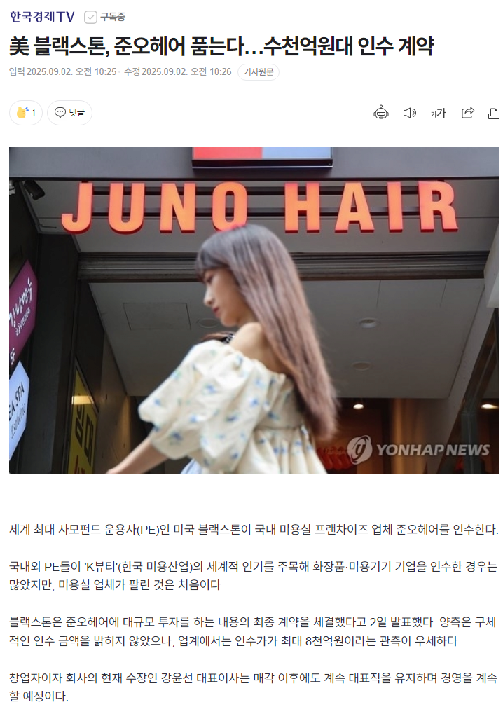 미국 블랙스톤이 한국 미용실 프랜차이즈 준오헤어 인수