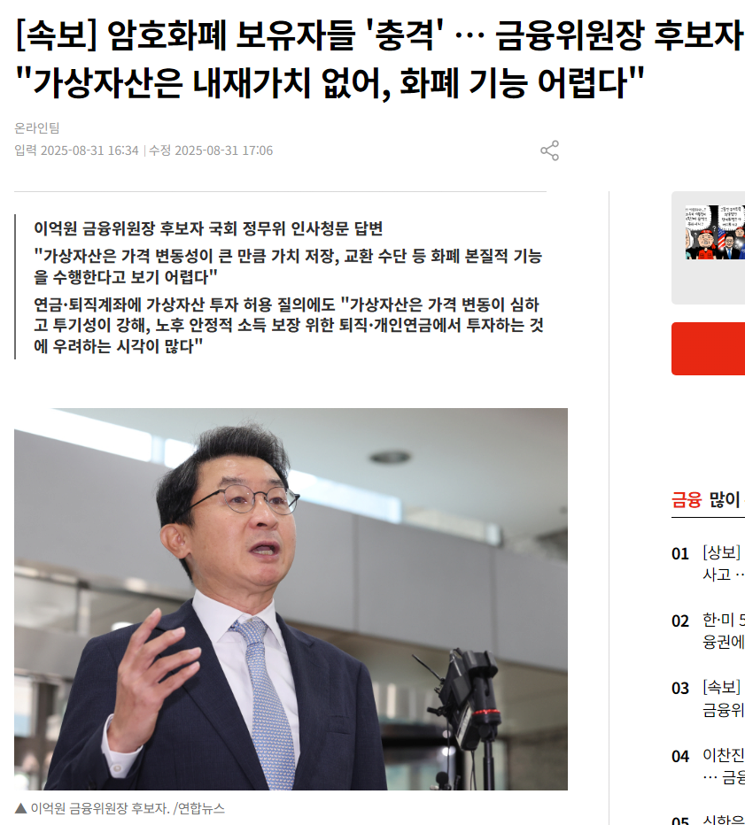 금융위원장 후보자가 가상자산 가치 없다고 말함
